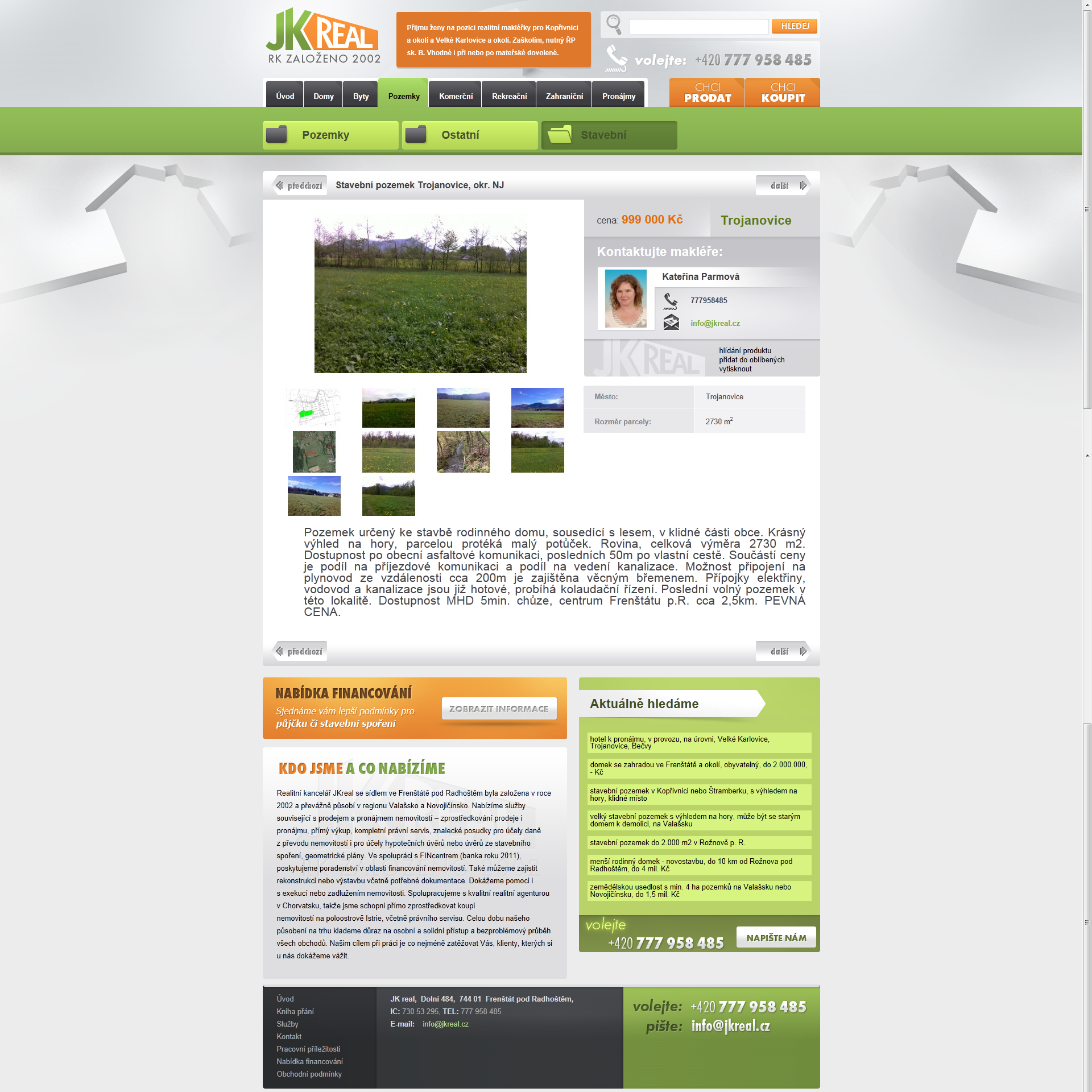 Web realitní kanceláře JKReal spojuje elegantní moderní design s přehledným a jednoduchým rozcestím pro nalezení nemovitosti dle Vaších přání. Web využívá zajímavou Google Mapu, sadu formulářů pro kontaktováni realitních makléřů a další služby pro úspěšné zprostředkování dostupných služeb.